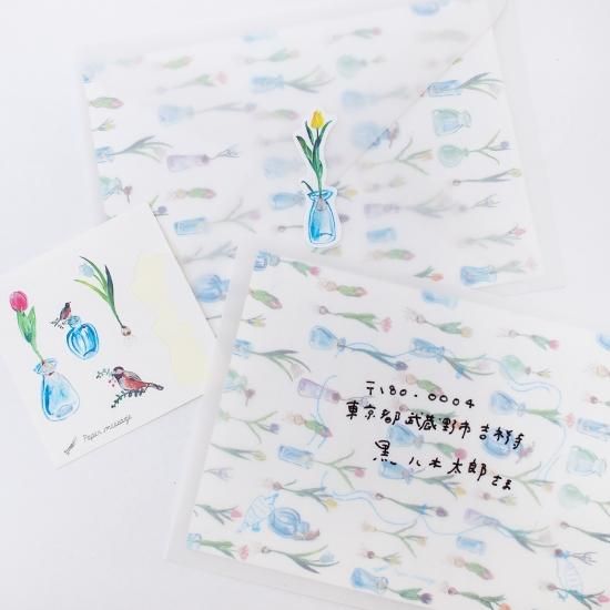 封筒はトレーシング封筒に鳥やお花が囲むように印刷されています。