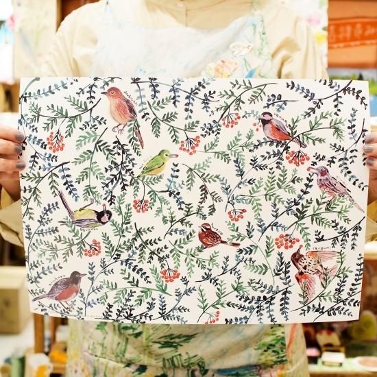 2021年の新柄「鳥と木の実 昼」の包装紙ができました。