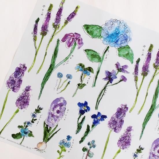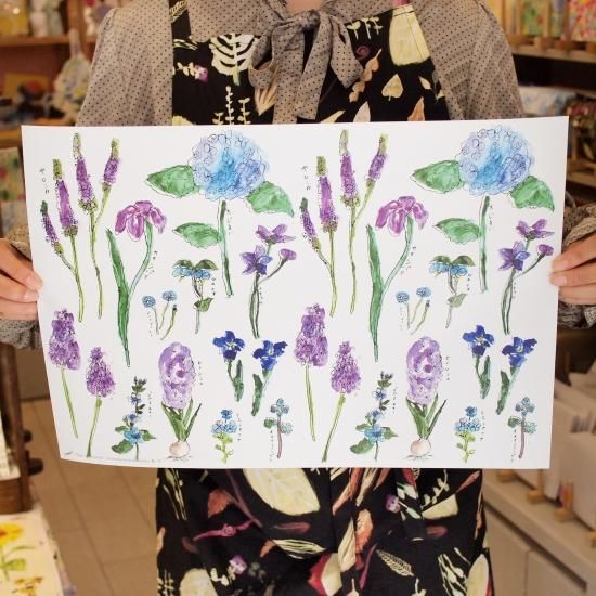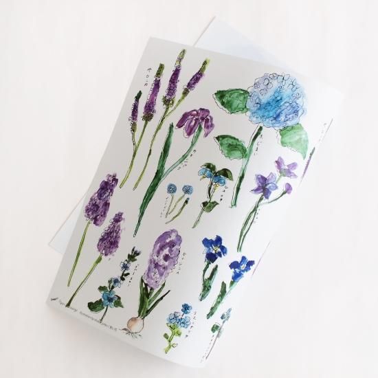 アジサイやベロニカ、ヒヤシンスなど青系のお花がたくさん描かれています。