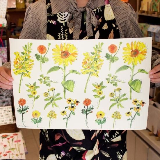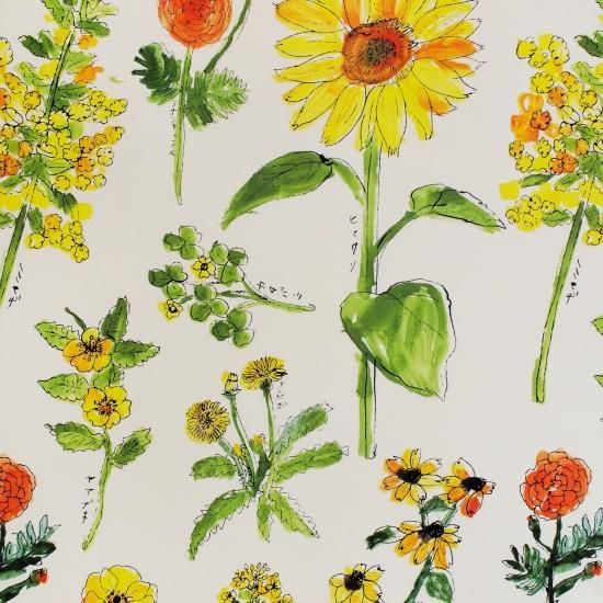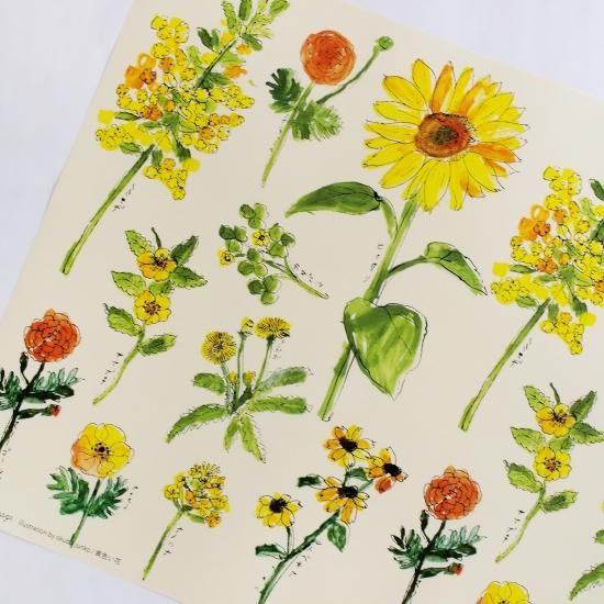 ミモザやヒマワリ、タンポポなど黄色系のお花がたくさん描かれています。