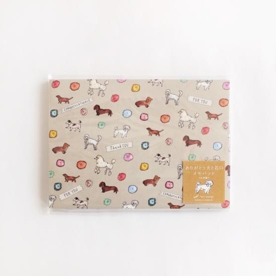 いろんな犬と色とりどりのお花が描かれたイラスト柄「ありがとう犬と花」