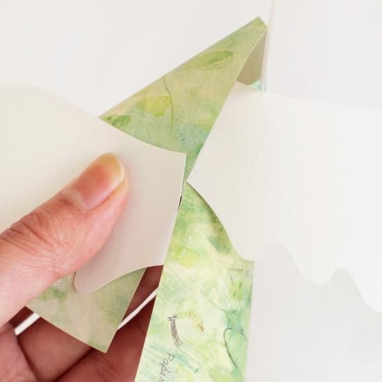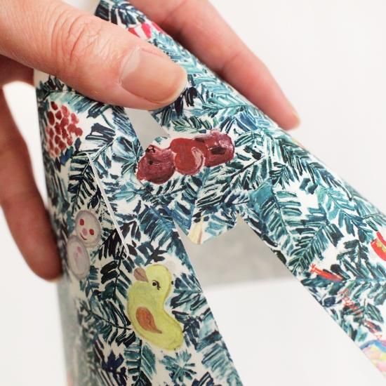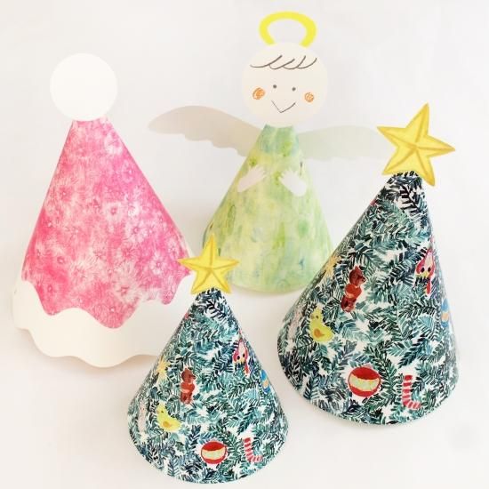 ツメの部分を切り込みに差し込めばくるっとまるまり、クリスマスツリーや帽子が完成!