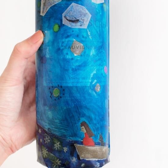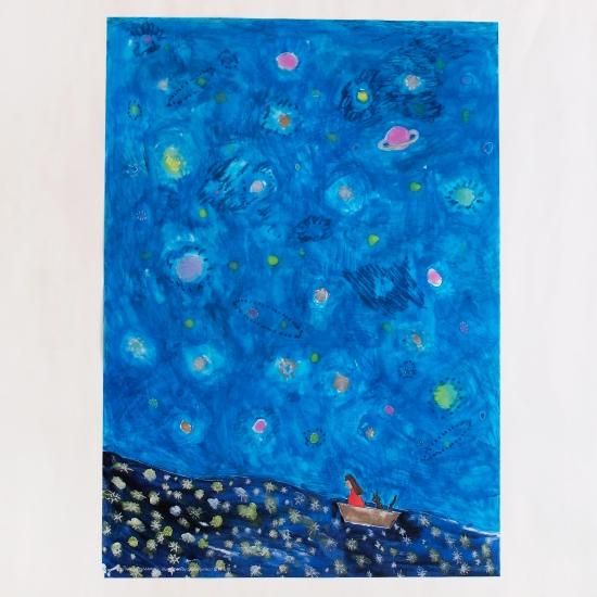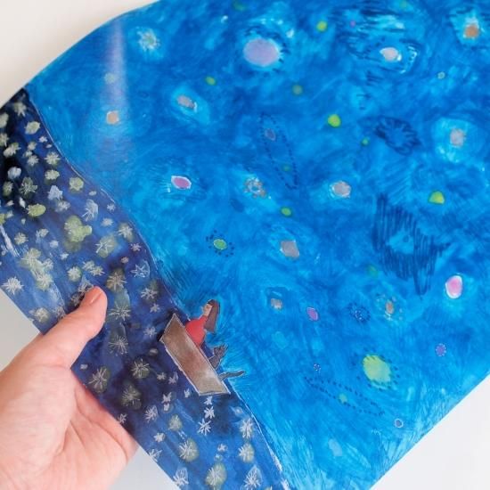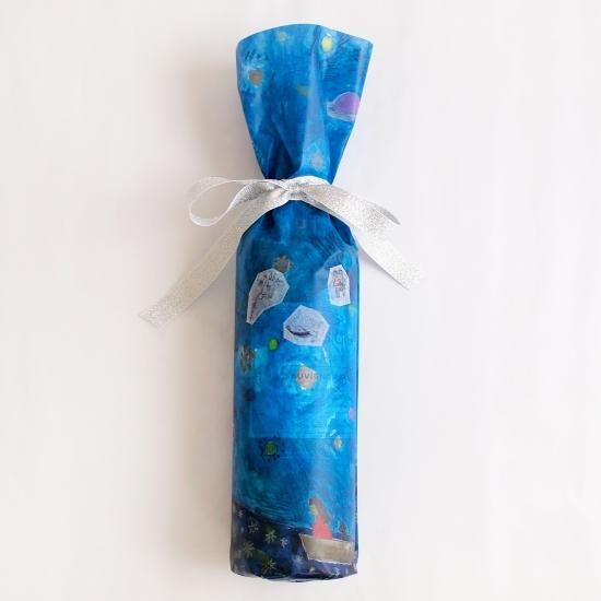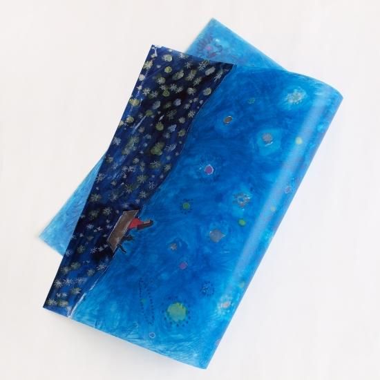 星の海を旅する猫と女の子をイメージして描かれた「星降る夜」の包装紙です。