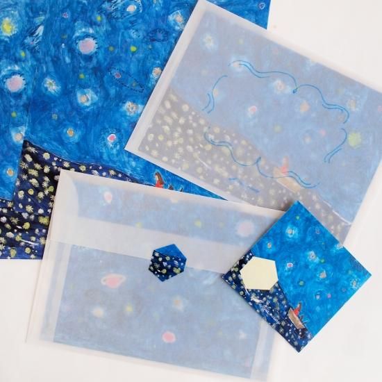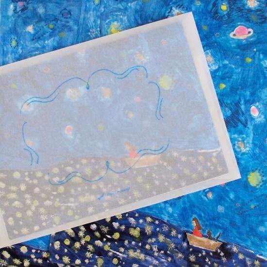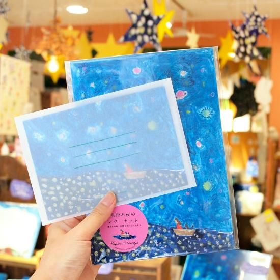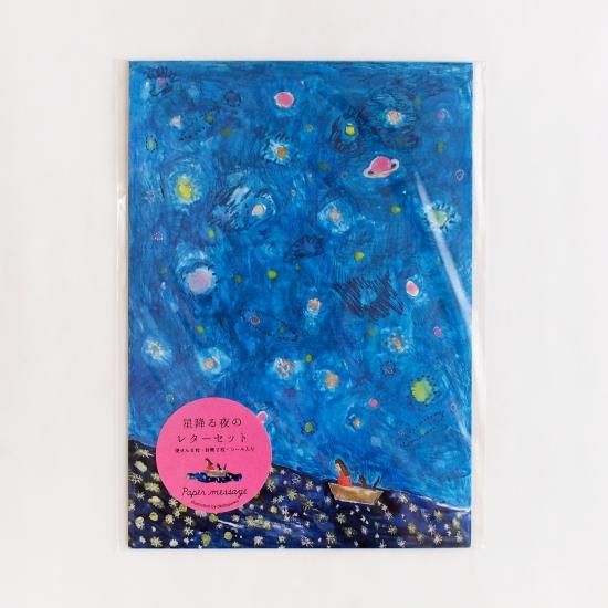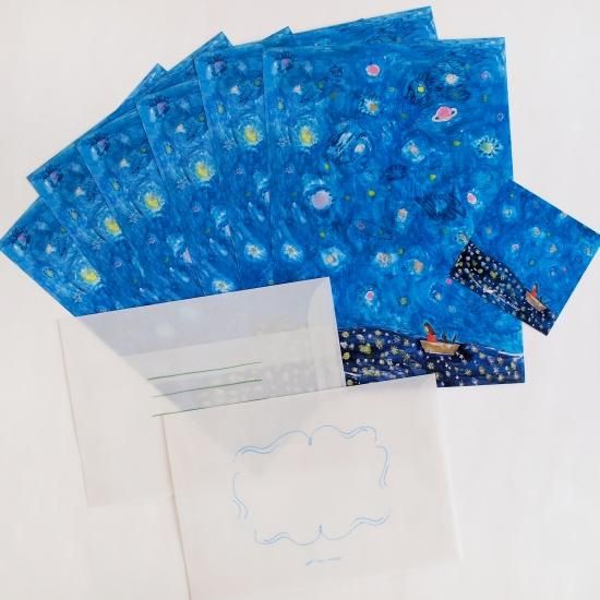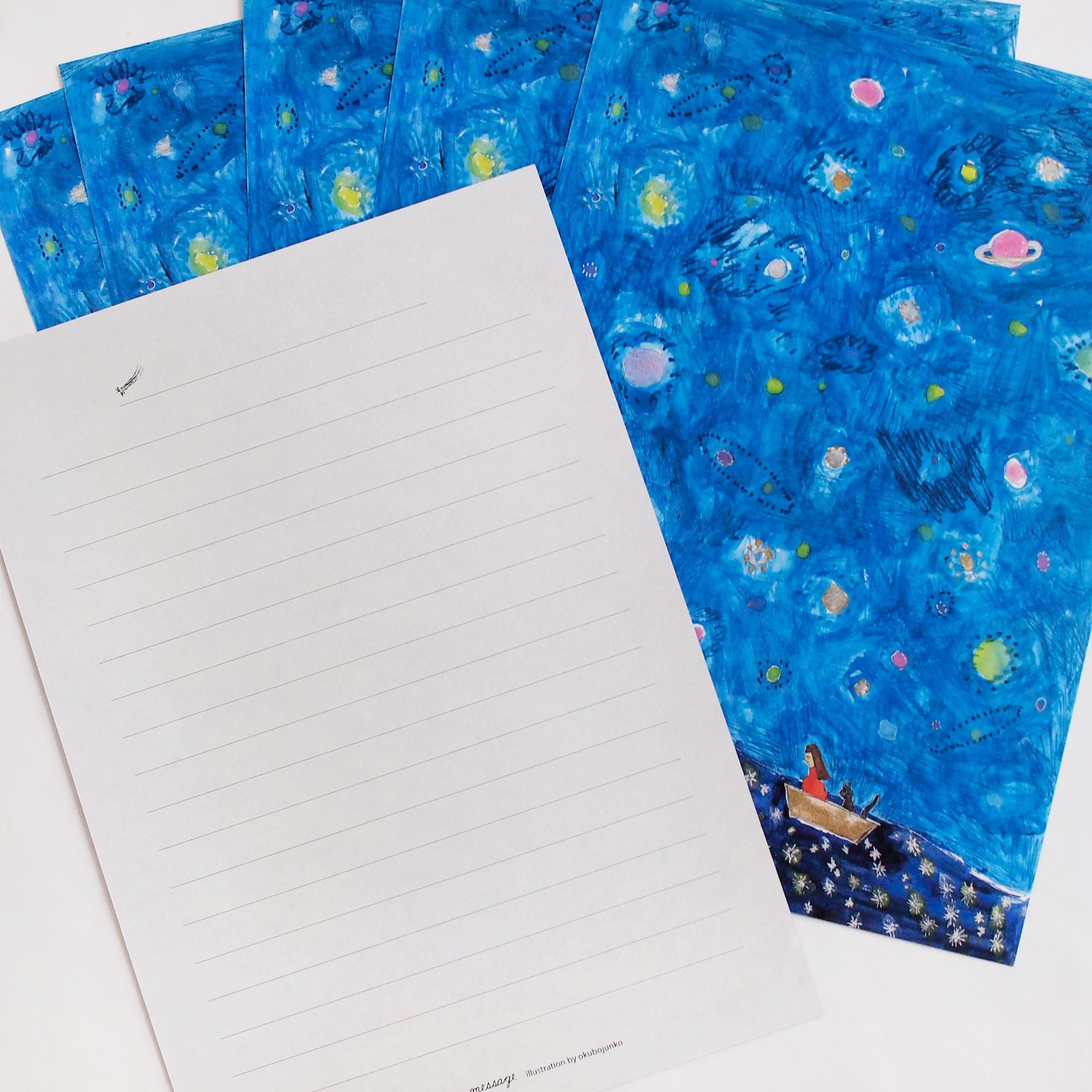 星の海を旅する猫と女の子をイメージして描かれた「星降る夜」のレターセットです。