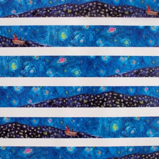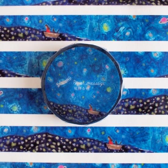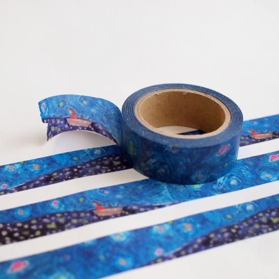 星の海を旅する猫と女の子をイメージして描かれた「星降る夜」のマスキングテープ です。