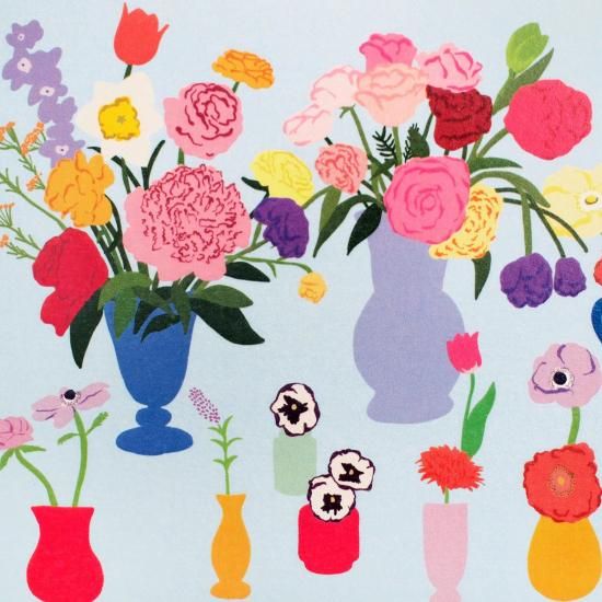 こちらの「たくさんの花」は、色とりどりのお花と花瓶が並んだ風景を描いたイラスト柄です。