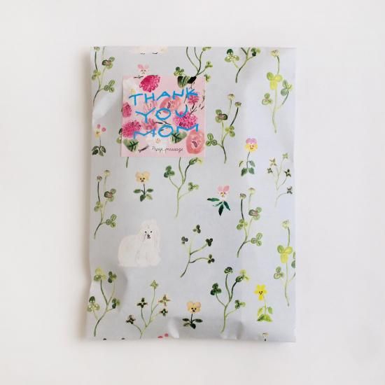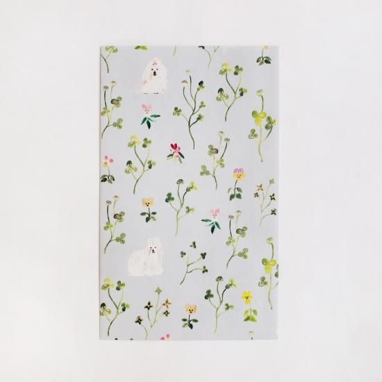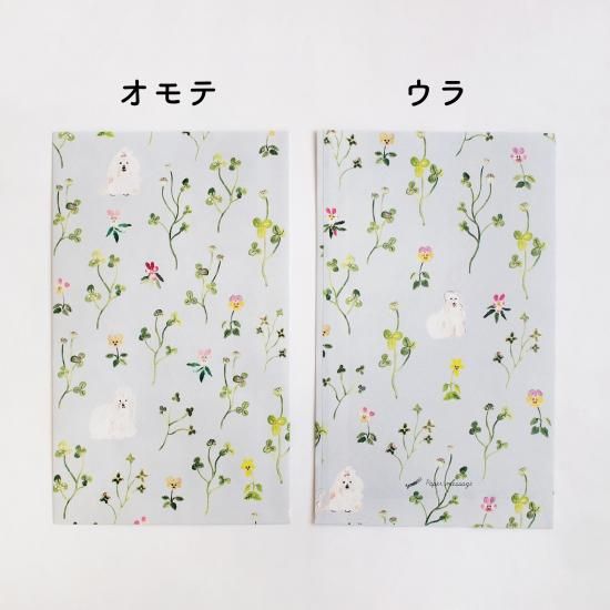 こちらの「クローバーと毛の長い犬」は、以前から沢山ご要望をいただいていただいていたクローバーモチーフのイラスト柄です。