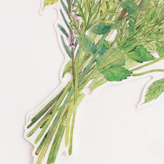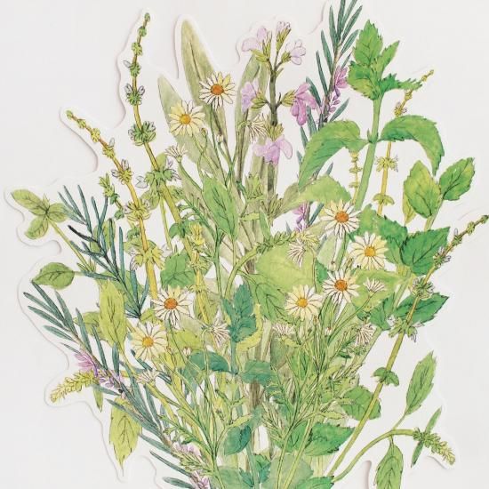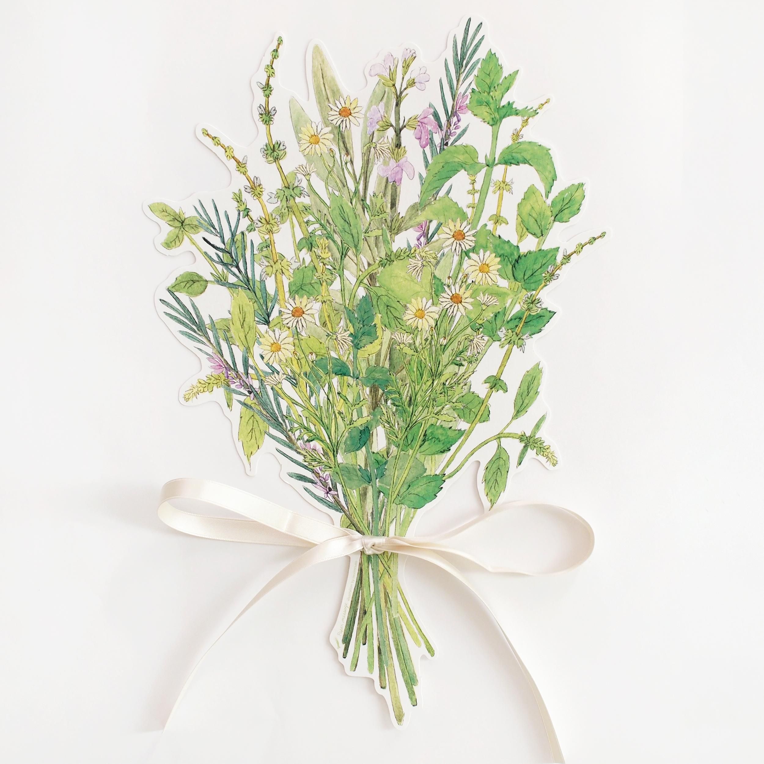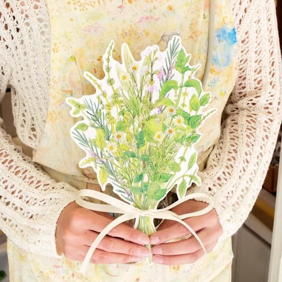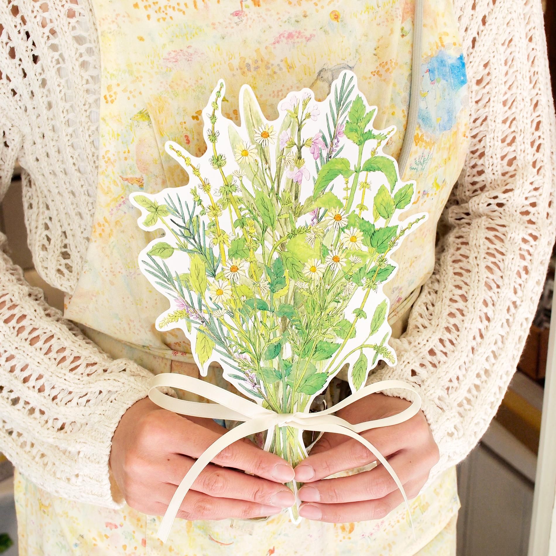 ミント、セージ、レモンバジル、カモミールなどの初夏のハーブの花束のカード。