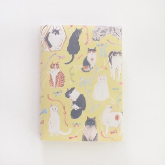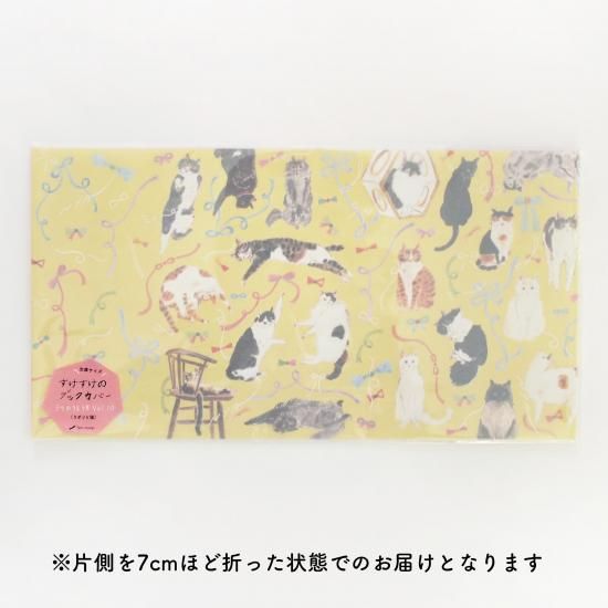 華やかなモチーフに囲まれたお祝いムードの猫たちが楽しめるイラスト柄の文庫サイズのブックカバーです。