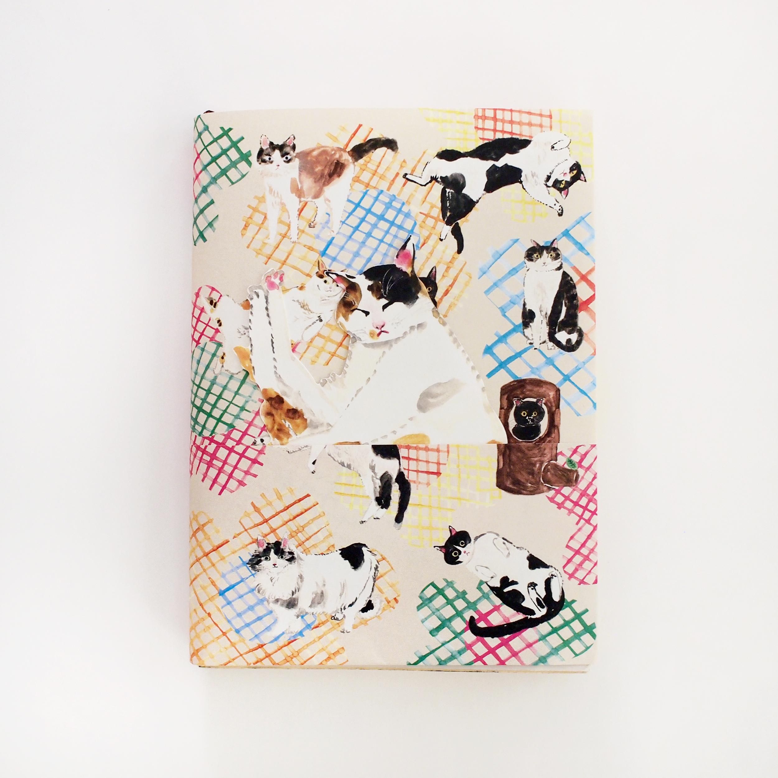 華やかなモチーフに囲まれたお祝いムードの猫たちが楽しめるイラスト柄の文庫サイズのブックカバーです。