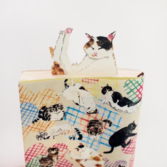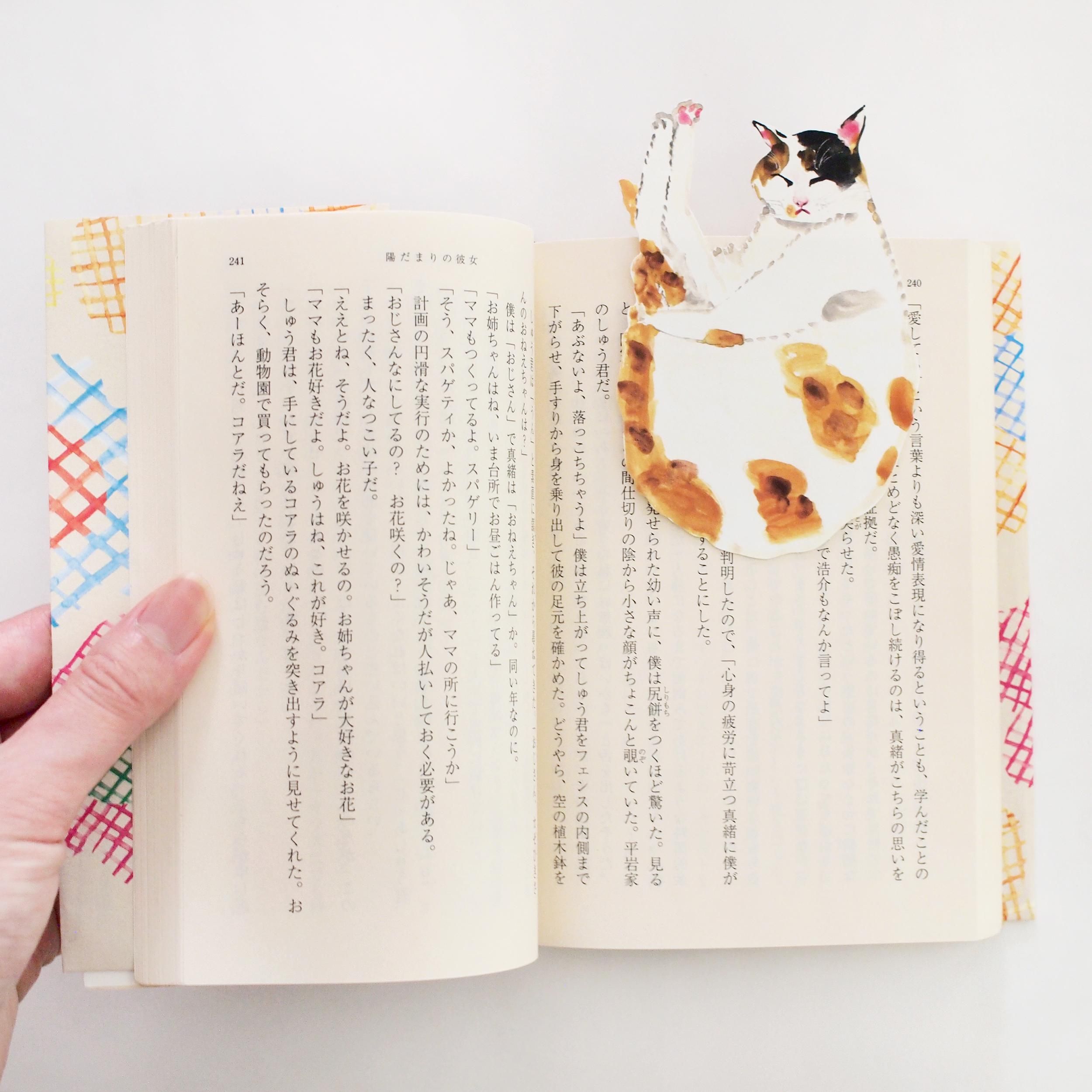 ブックカバーを折り返してできるポケットに猫ちゃんのしおりを差し込める仕様です。