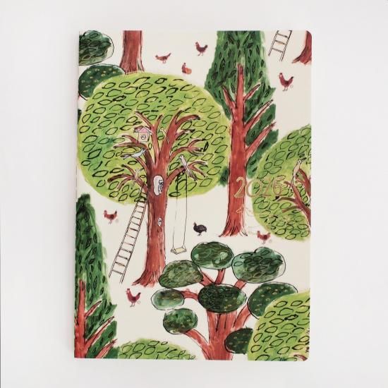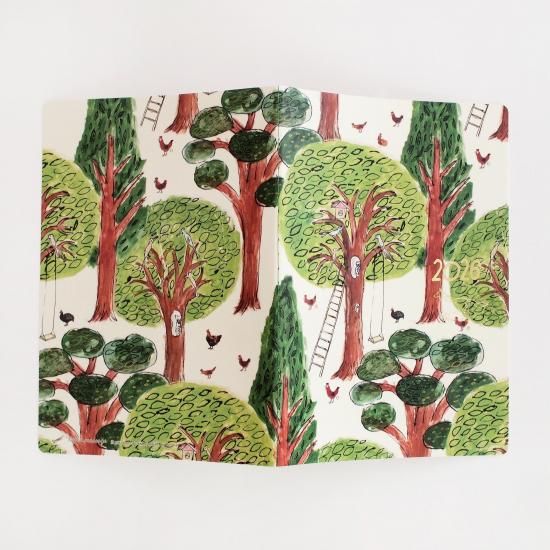 よく見ると土佐ジローやホロホロ鳥など、沢山の鳥たちが描かれたイラスト柄「bird house」のスケジュール帳です。