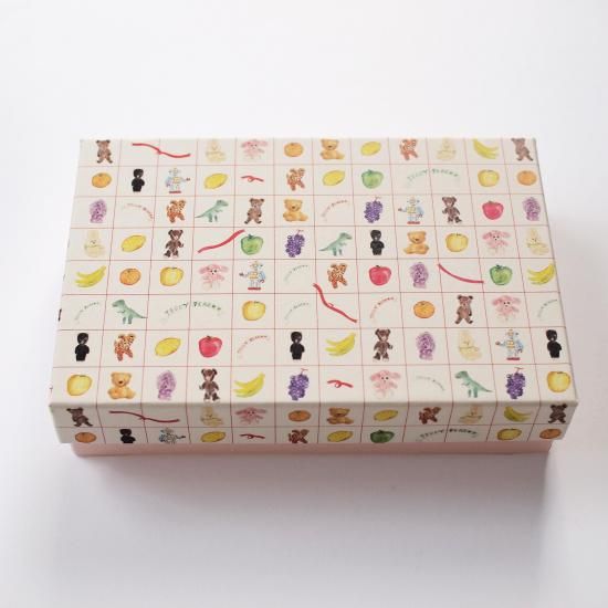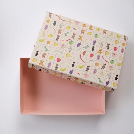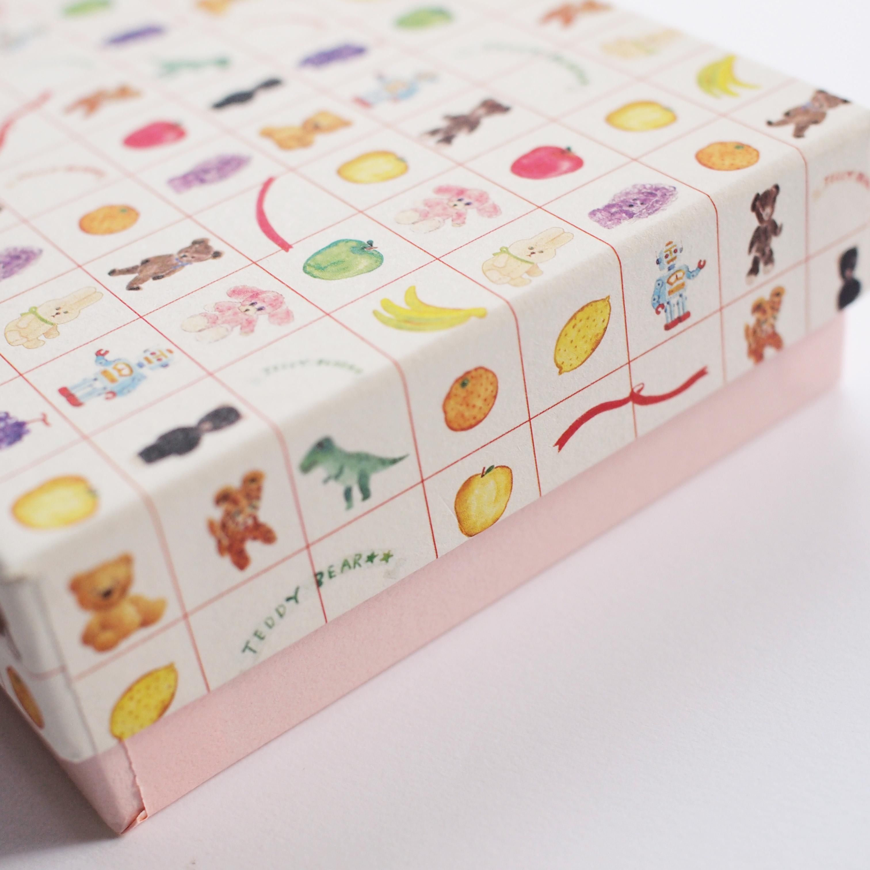 ぬいぐるみやロボット、色とりどりのフルーツなど沢山のプレゼントが並んだイラスト柄「プレゼントのぬいぐるみ」の貼り箱です。