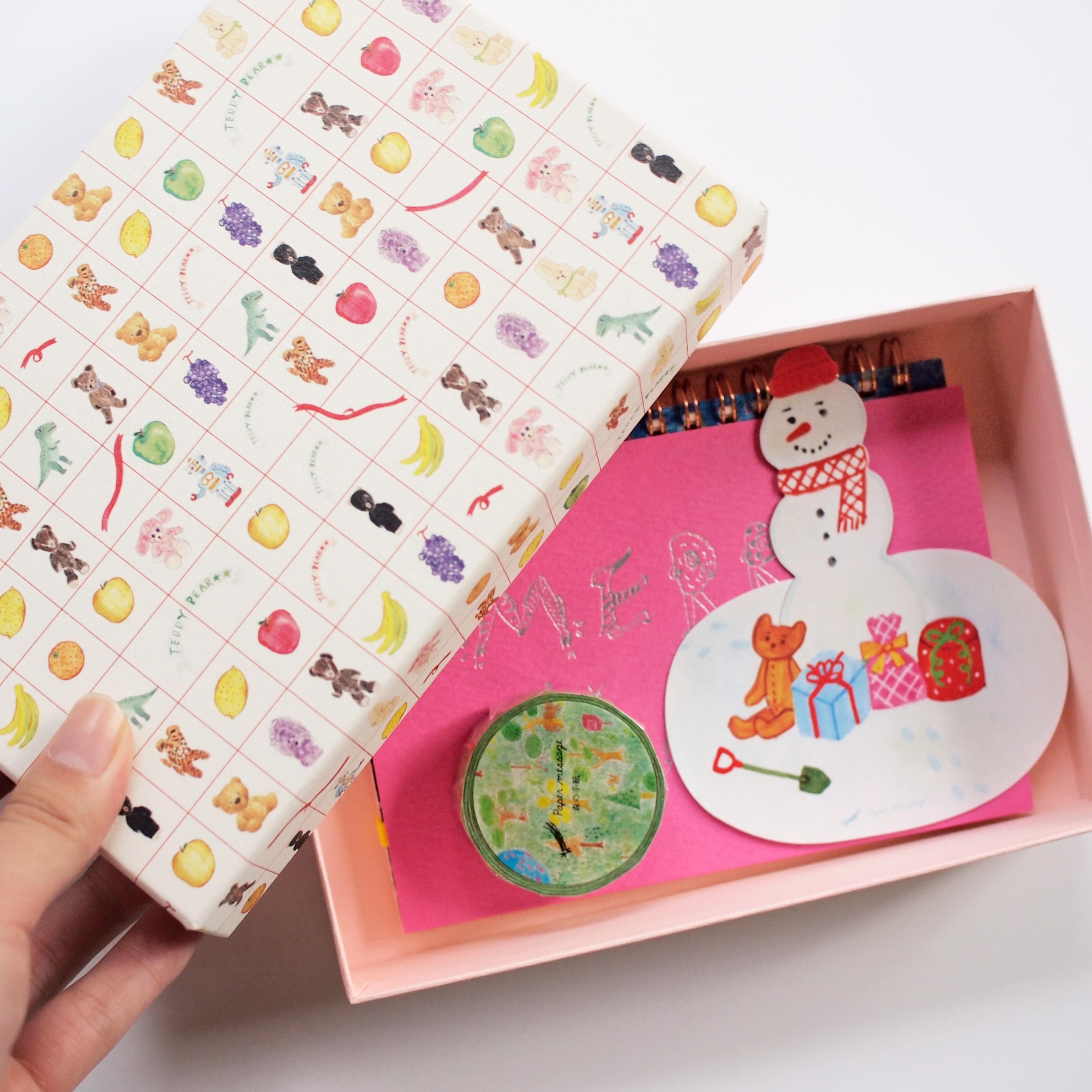 イラストに合わせて受け箱の色を変えており、ハガキサイズの「プレゼントのぬいぐるみ」は薄いピンクになっています。